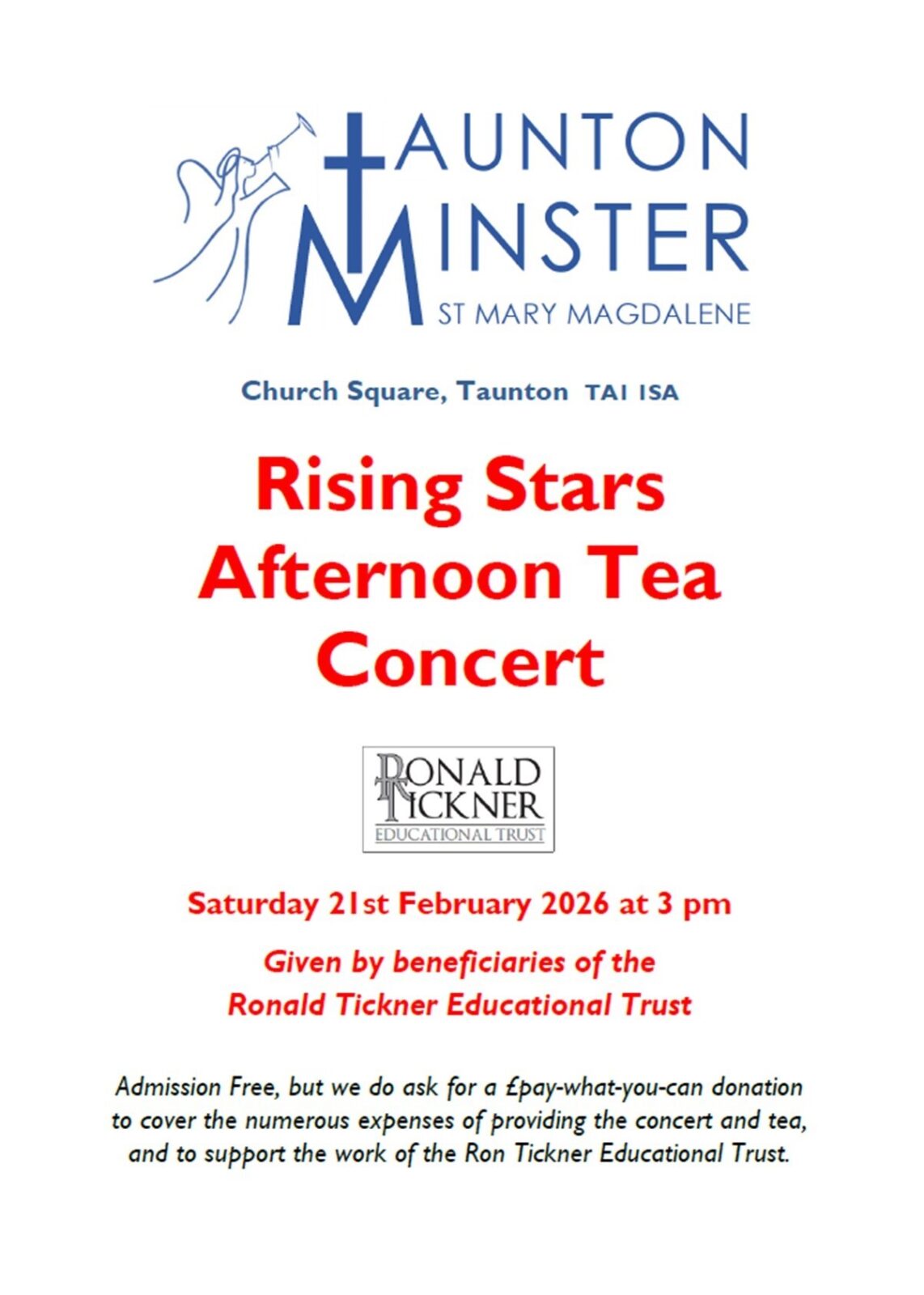We kindly invite a pay-what-you-can donation to help cover the cost of the concert and tea, and to support the ongoing work of the Ronald Tickner Educational Trust in nurturing the next generation of musical talent.